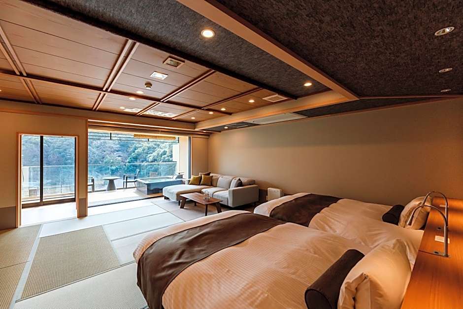 This twin room's standout feature is the private open-air bath. The spacious twin room features air conditioning, tatami, a balcony with city views as well as a private bathroom boasting a bath. The unit has 2 beds and 2 futons.